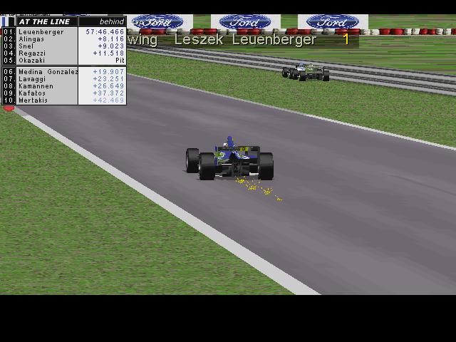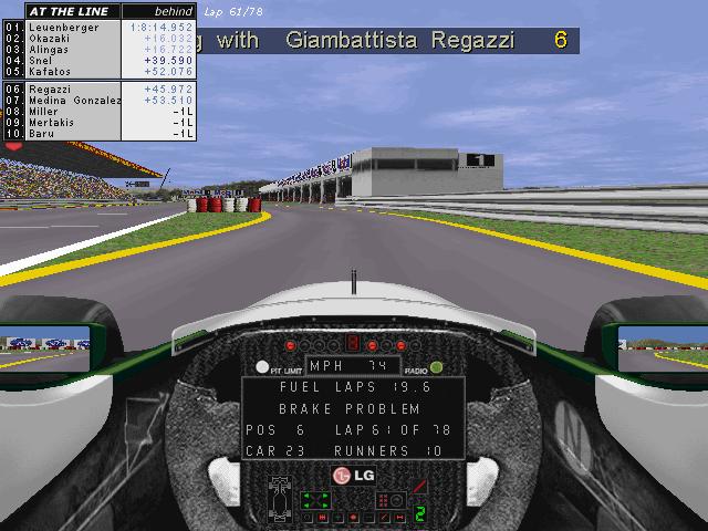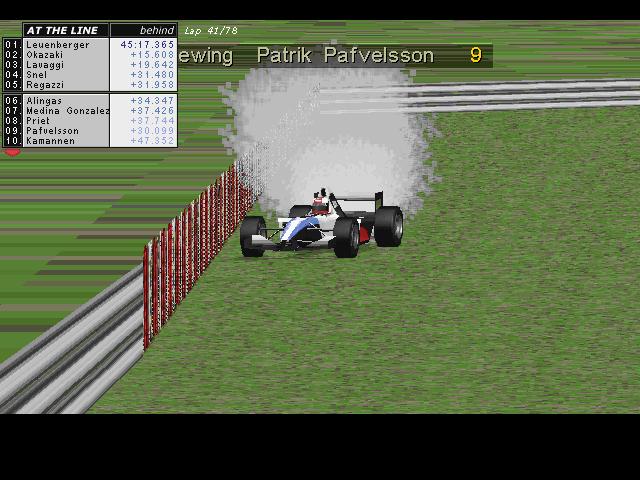 Kafatos brilliantly braves the odds resisting race leader Leuenberger, eventually allowing himself to be lapped. Unfortunately Snel gets by for 5th. Lap 77:
