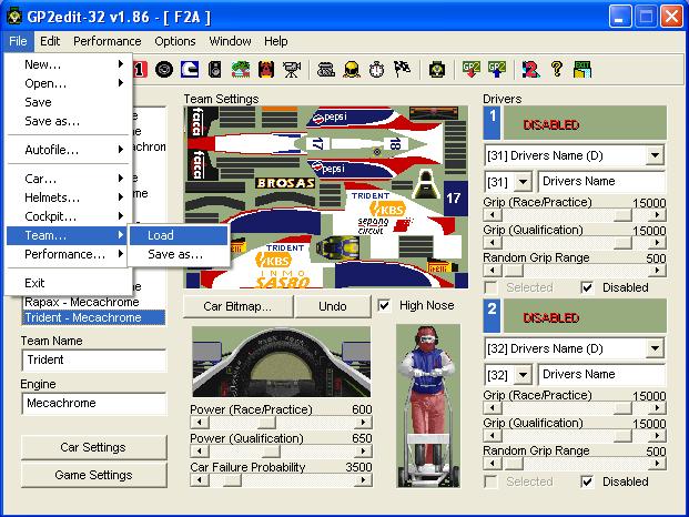 ALL helmets and Cars are my own drawing. As before, I have uploaded 13 teams. So, save the folder A on you computer somewhere (perhaps C / GP2 / Carests / F2_2017 / A) open a new / blank carset in GP2Edit (by Steve Young), load the 13 individual teams (diagram shows: file > team > load), disable the two drivers in the 14th team, and you are ready to race!