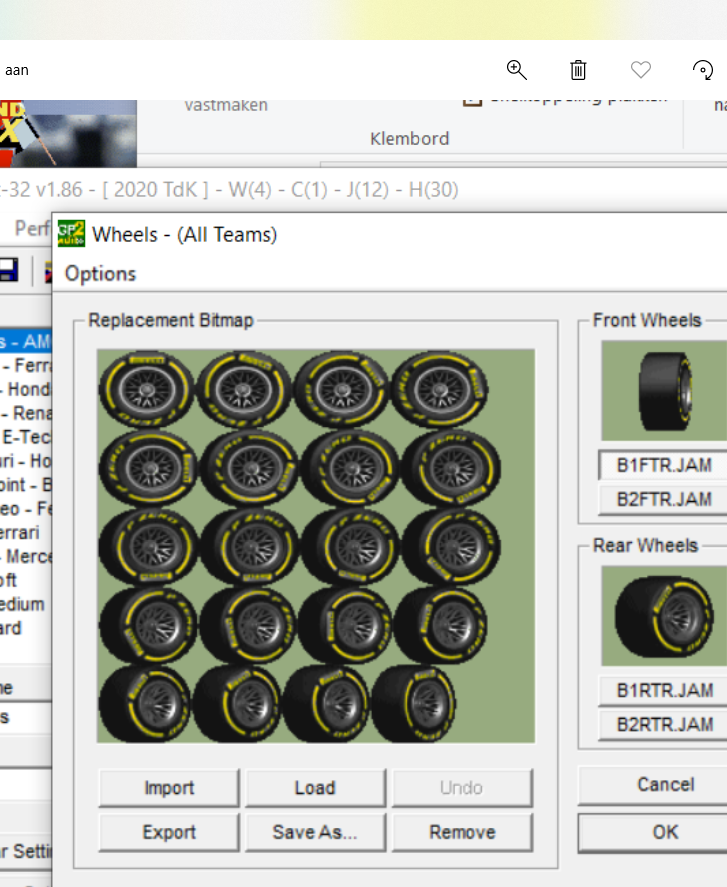 Thnx for the feedback Roberto. I did export the jam files after I put in manually the wheels with the same texture. And it worked, no more flickering tyres.rremedio wrote: ↑25.12.2020, 16:32The easiest way would be to find jam files with the same texture dimensions as the one in the carset, put them in your gamejams folder and then export the jams from the carset with GP2Edit. If that's not possible, maybe the carset author has working jams they can share?