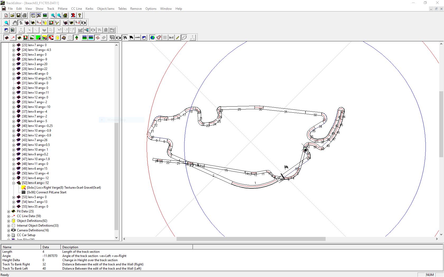 Barcelona has I believe 92 sections, I didn't need all of these to make it fit the long beach 83 overlay. I started by straightening the track and then doing the sections one at a time. I think it matches my bitmap well. The problem right now I am having is that I don't know how to move the start of the pitlane so it is in a different position.